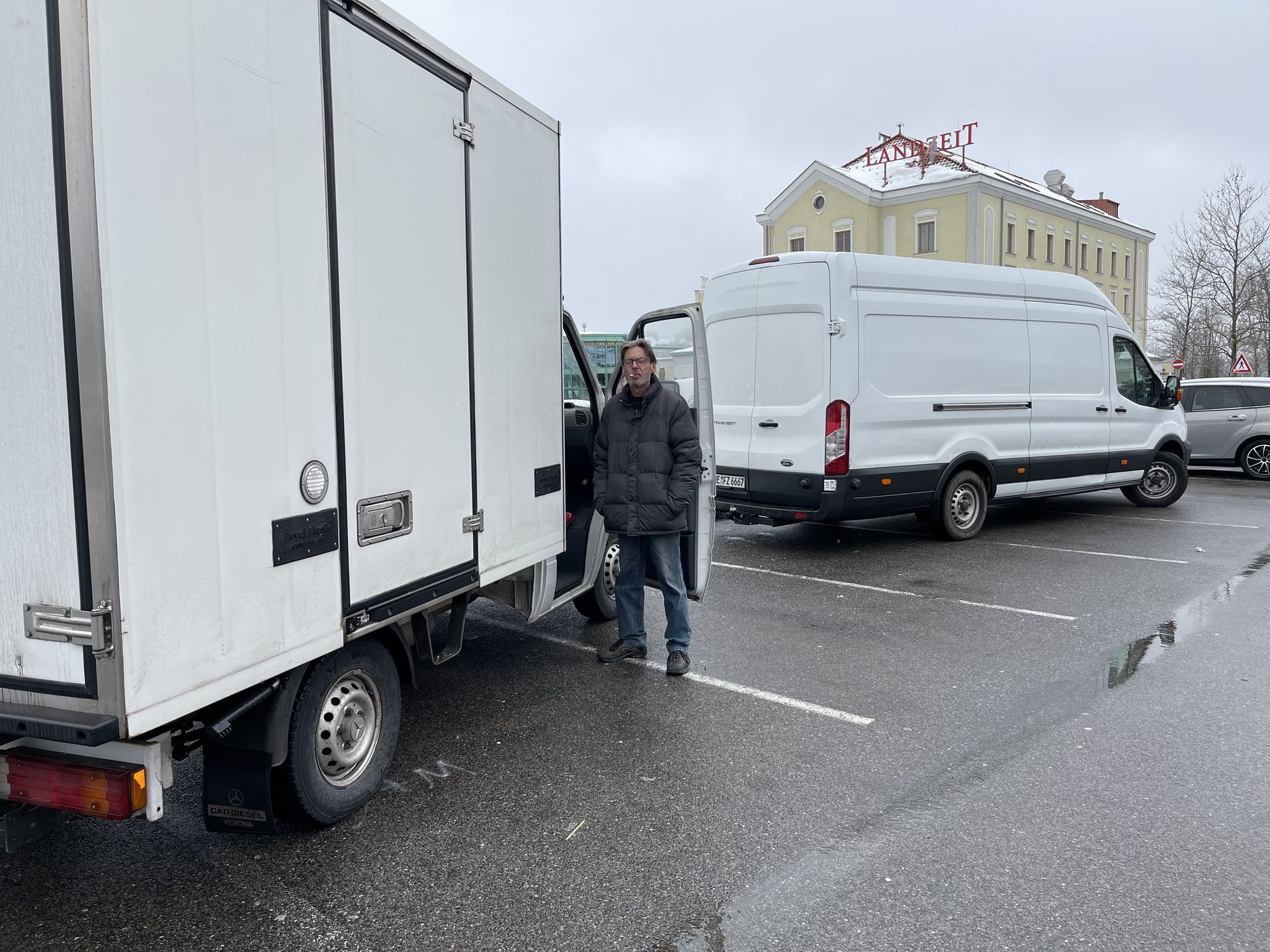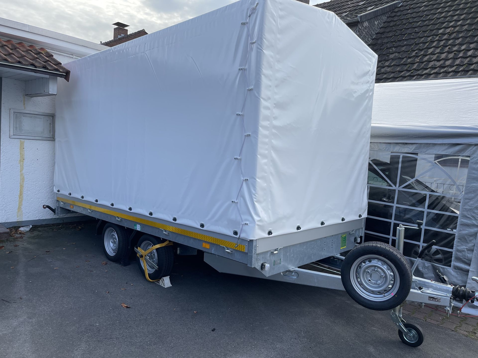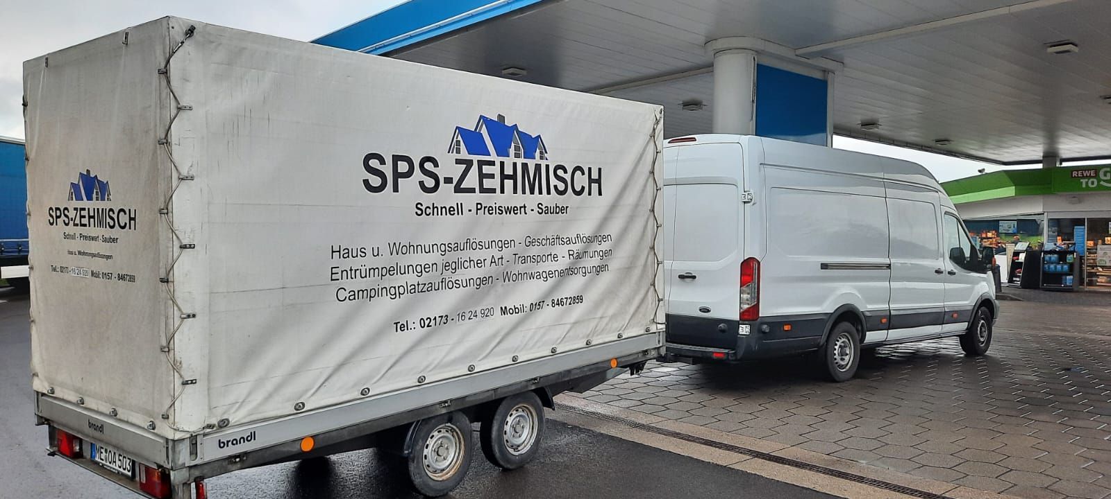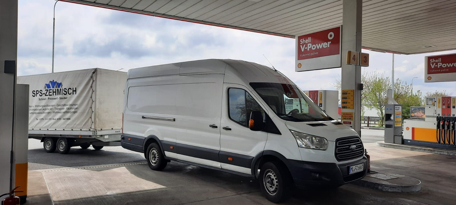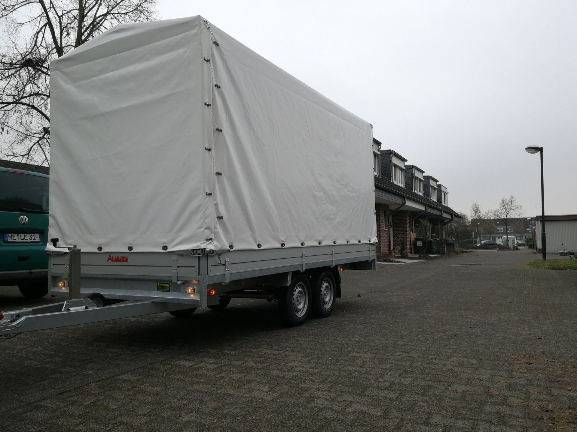 Ein Lieferwagen Länge L4 und Anhänger 4 Meter, beide Fahrzeuge ca. 2 Meter hoch.